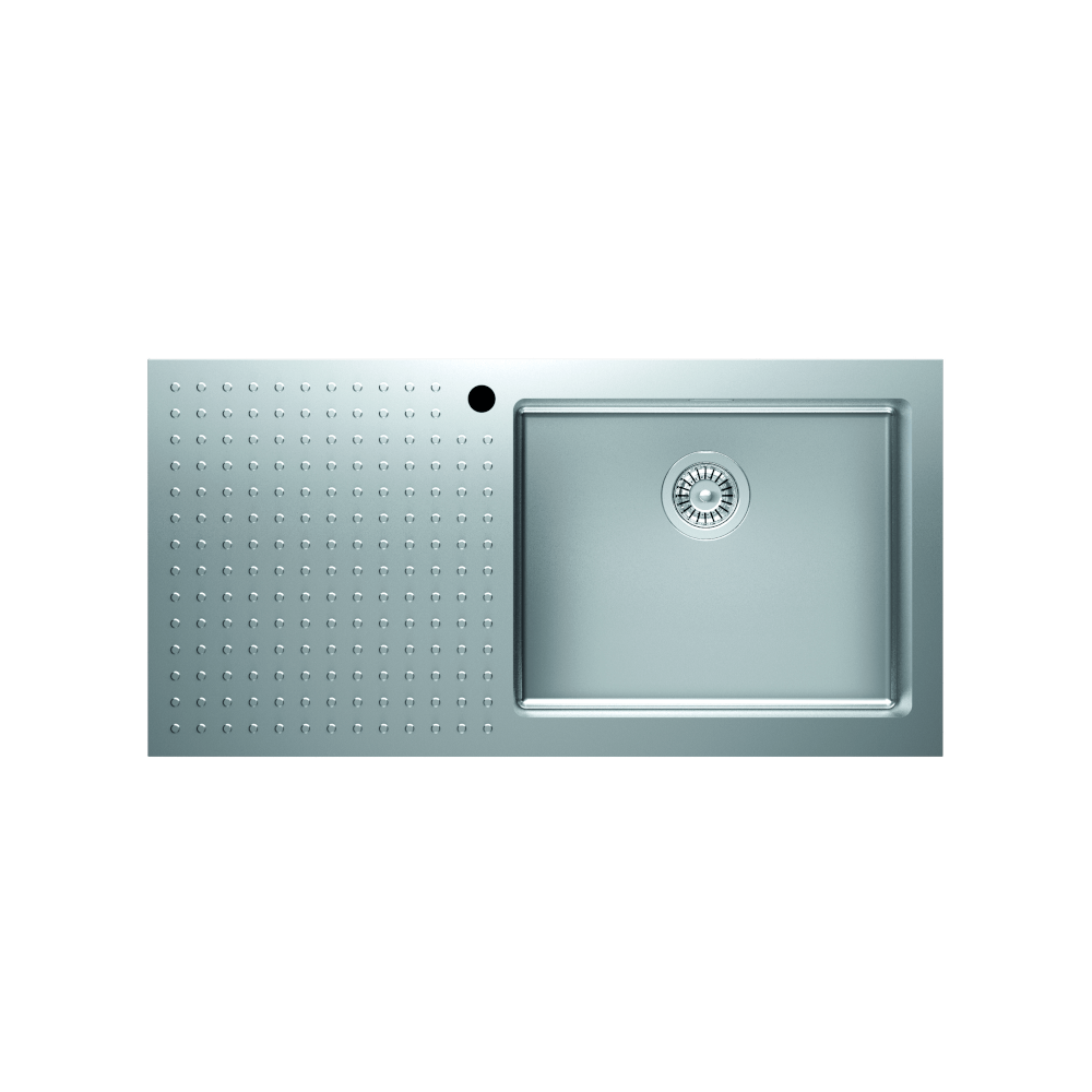 Italian Designed and Manufactured, this modern sink is made from commercial quality thick 304 Stainless Steel. With a minimal radius, the sink is characterised by its unusual texture with circular patterns.